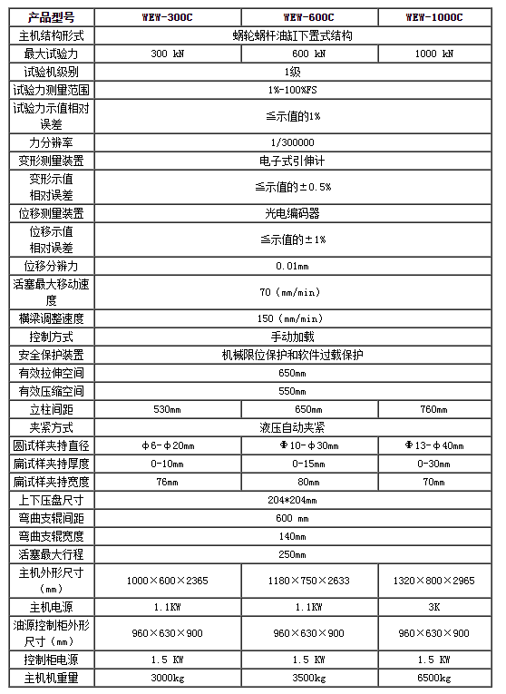 本機(jī)由蝸輪蝸桿下置式主機(jī)及琴式油源控制柜組成,油泵采用意大利馬祖奇進(jìn)口低噪音高性能齒輪泵。拉伸空間位于主機(jī)上方,壓縮、彎曲試驗(yàn)位于主機(jī)下方即中橫梁和工作臺之間。試驗(yàn)空間的調(diào)整通過移動中橫梁來實(shí)現(xiàn),中橫梁升降采用蝸輪蝸桿傳動。手動調(diào)整送油閥進(jìn)油量來實(shí)現(xiàn)材料的拉伸、壓縮、彎曲等試驗(yàn)。試驗(yàn)結(jié)束后自動采取材料的FM、REH、REL、RPO.2、RP1、RM和彈性模量E等實(shí)驗(yàn)結(jié)果。