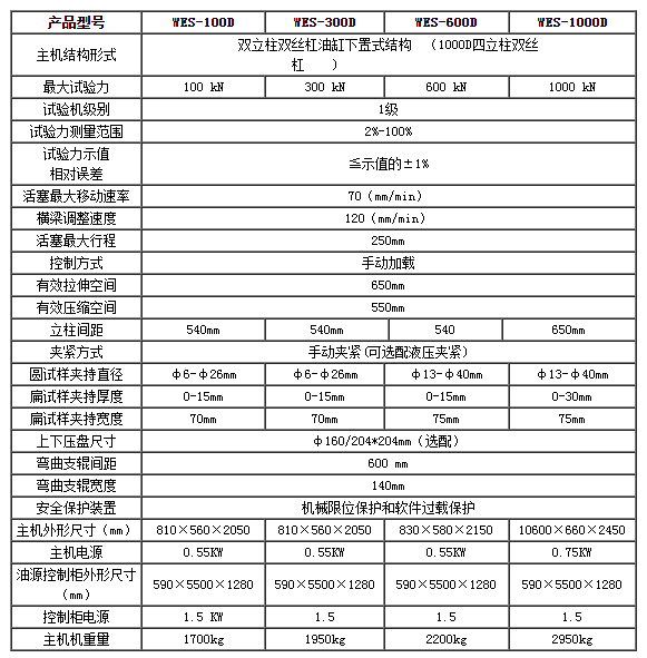 本機由雙立柱雙絲杠油缸下置式主機及琴式油源控制柜組成。拉伸空間位于主機上方,壓縮、彎曲試驗位于主機下方即中橫梁和工作臺之間。試驗空間的調整通過移動中橫梁來實現,中橫梁升降采用鏈條傳動。手動調整送油閥進油量來實現材料的拉伸、壓縮、彎曲等試驗。試驗完成后自動求取材料的最大力、抗拉強度等試驗結果。